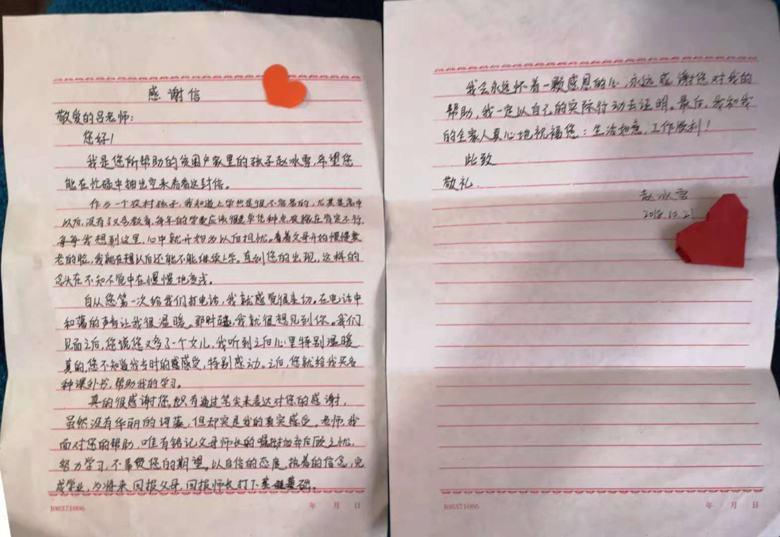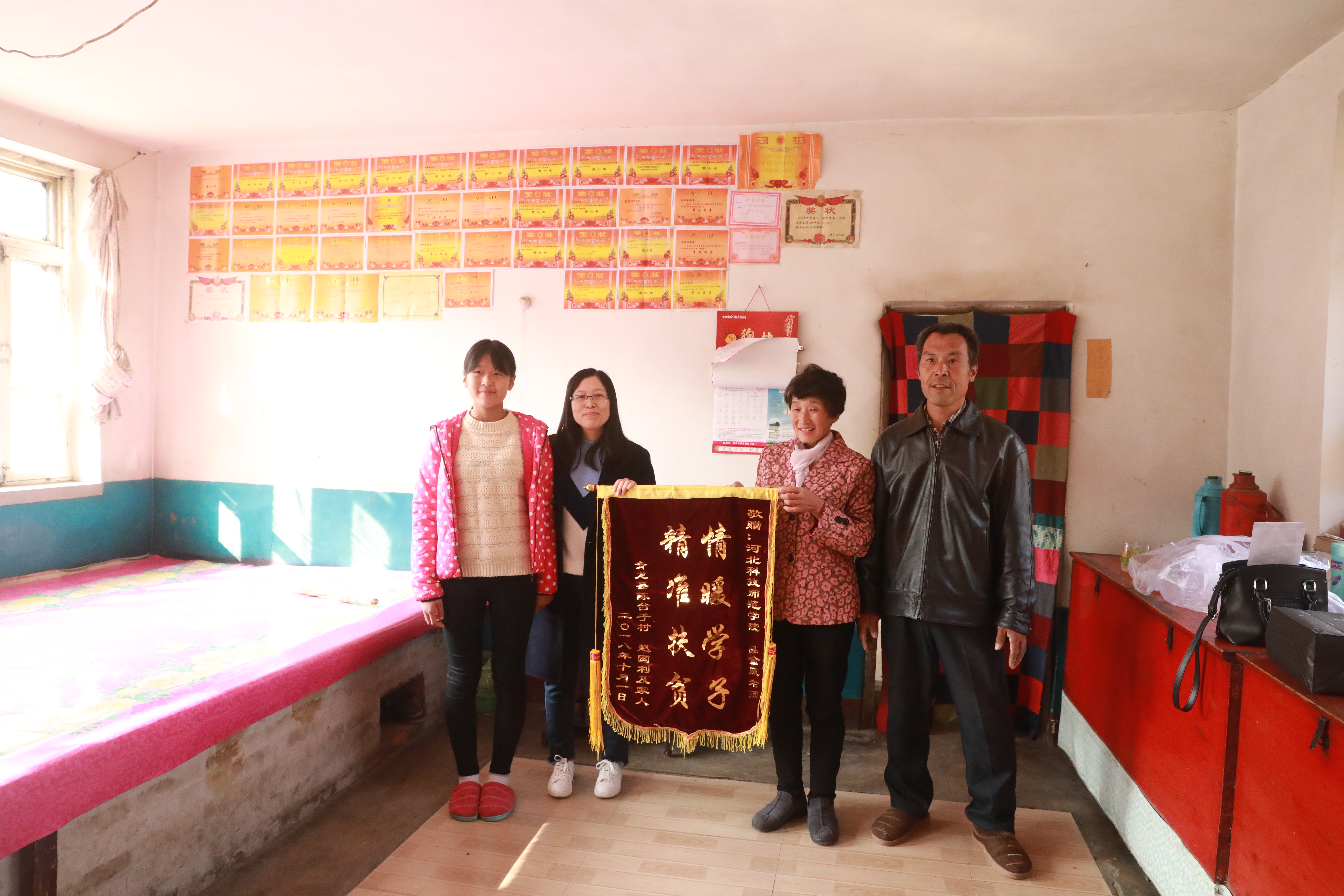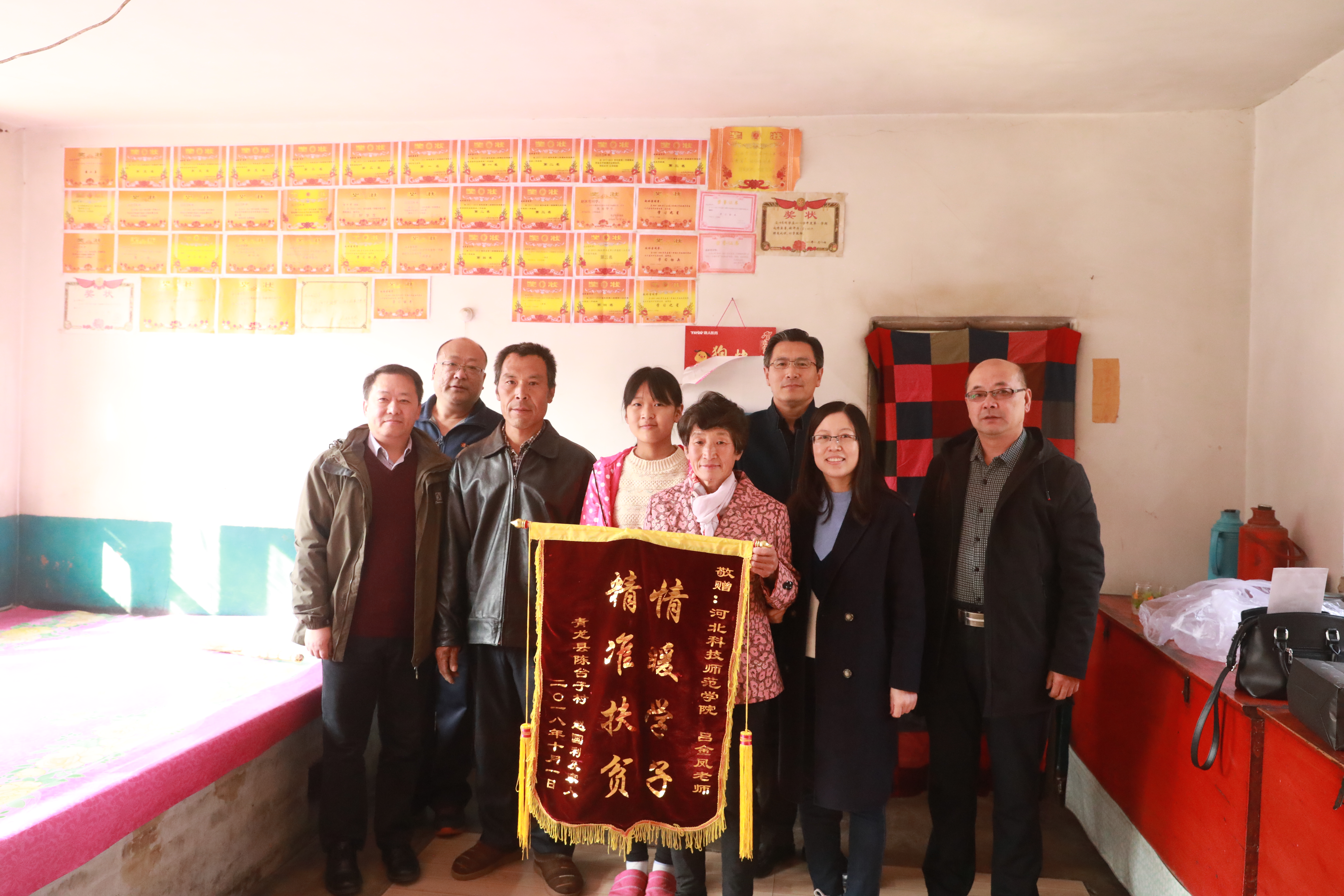 2018年11月3日,青龙陈台子村贫困户赵国利一家人,向我院结对帮扶责任人吕金凤老师赠送一面写有“情暖学子 精准扶贫”的锦旗。他们正在上初中的女儿赵冰雪给吕金凤老师写了一封情真意切的感谢信,一家人真心表达对吕金凤老师三年来对他们真情暖心扶贫助学的感激之情。beat365驻陈台子村工作组组长、第一支部书记王伟,数信学院领导参加了赠送锦旗仪式。