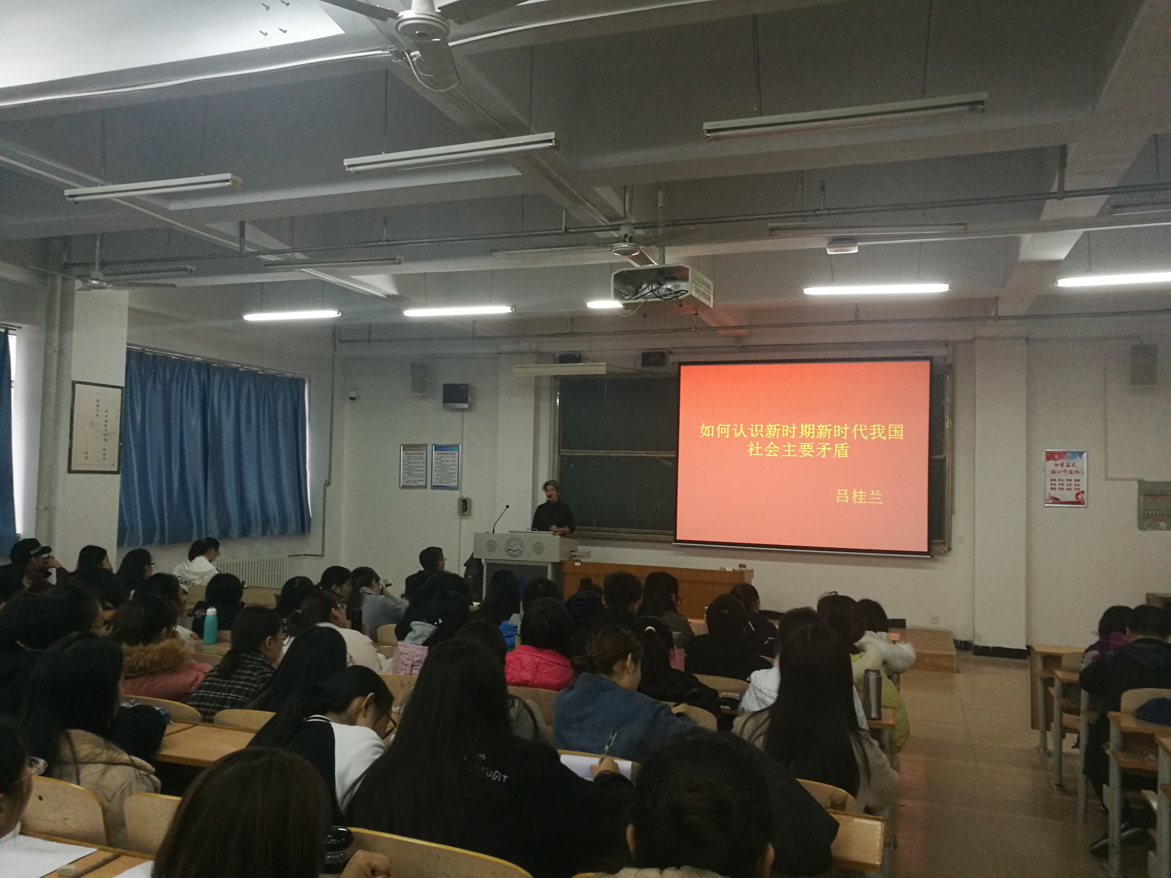 吕桂兰老师以如何认识新时期新时代我国社会主要矛盾为主题,从寻找道路、目标任务和历史使命等方面深入浅出的分析了新时期与新时代的区别;运用矛盾分析法深刻阐述了新时期新时代我国社会主要矛盾的具体体现;深刻解读了党的十九大报告提出的新时代我国社会主要矛盾已经转化为人民日益增长的美好生活需要和不平衡不充分的发展之间的矛盾,这一重大判断的现实意义;最后,吕桂兰老师勉励数信学院大学生要结合自身的学科优势,在互联网+、大数据、人工智能科技高速发展的时代背景下,抢抓机遇、迎接挑战,将创新精神融入未来朝阳产业中,改善行业发展不平衡不充分的现状,为实现人民对美好生活的向往而努力奋斗,把报效祖国、造福人民、建功立业作为自己人生的崇高理想。