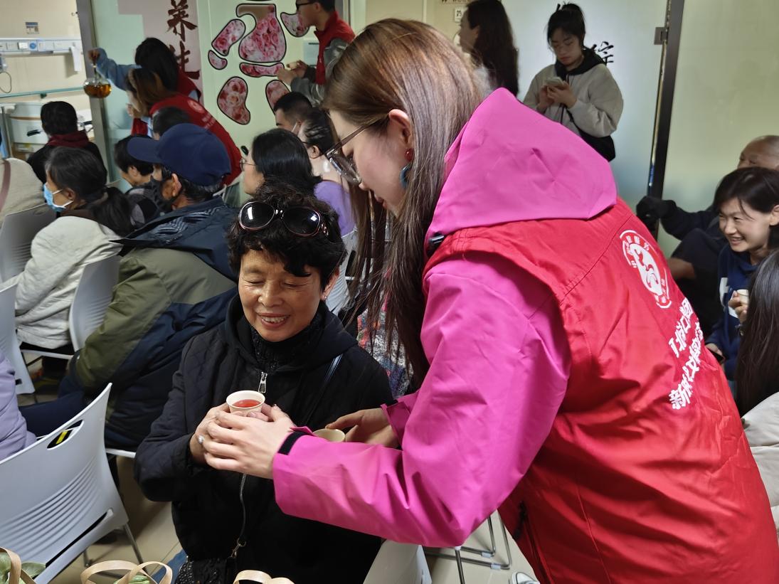 活动现场,志愿者们分工明确、主动作为:一方面,积极协助医护人员维持诊区秩序,引导老年患者有序排队进行中医检查,耐心细致地解答就诊流程、科室分布等疑问,缓解患者就医焦虑;另一方面,贴心准备了温热的山楂养生茶饮,为等候就诊的老人递上饮品,用细微举动传递关爱。