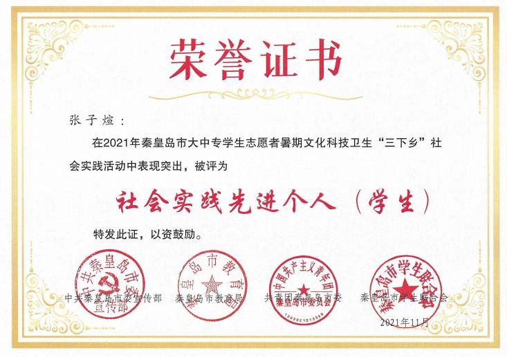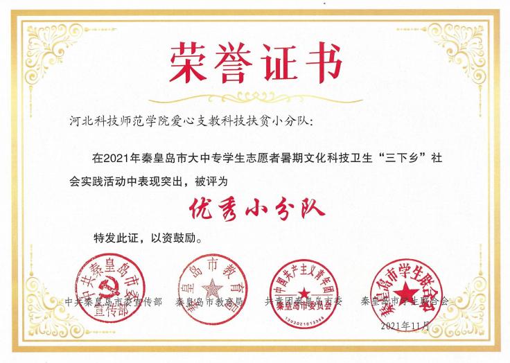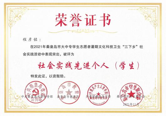 在团市委2021年秦皇岛市大中专学生志愿者暑期文化科技卫生“三下乡”社会实践活动表彰中,学院“爱心支教科技扶贫小分队”被评为优秀小分队,张子煊、程彦铭被评为社会实践先进个人(学生)。