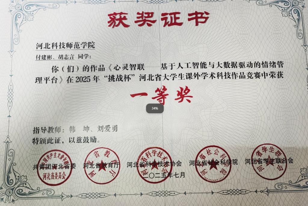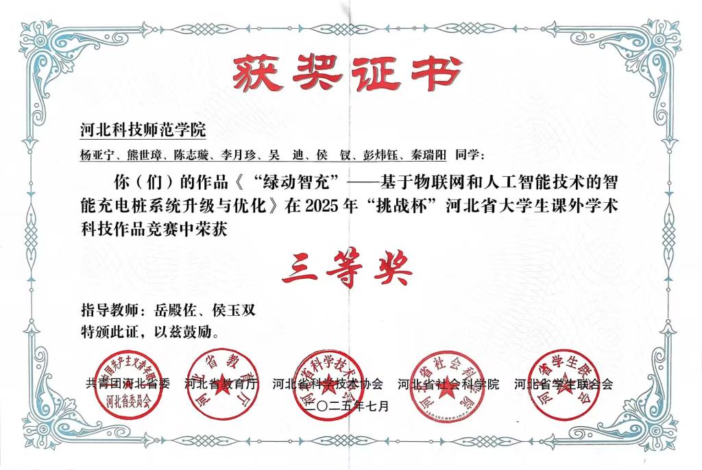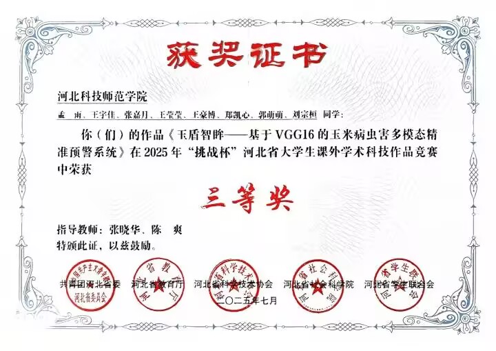 在2025年“挑战杯”河北省大学生课外学术科技作品竞赛中,我院韩坤老师指导(付建彬、胡志言参加)的作品《心灵智联——基于人工智能与大数据驱动的情绪管理平台》荣获一等奖、张晓华、陈爽老师指导(孟雨等同学参加)的作品《玉盾智眸——基于VGG16的玉米病虫害多模态精准预警系统》和岳殿佐、侯玉双老师指导(杨亚宁等同学参与)的作品《“绿动智充”——基于物联网和人工智能技术的智能充电桩系统升级与优化》荣获三等奖。