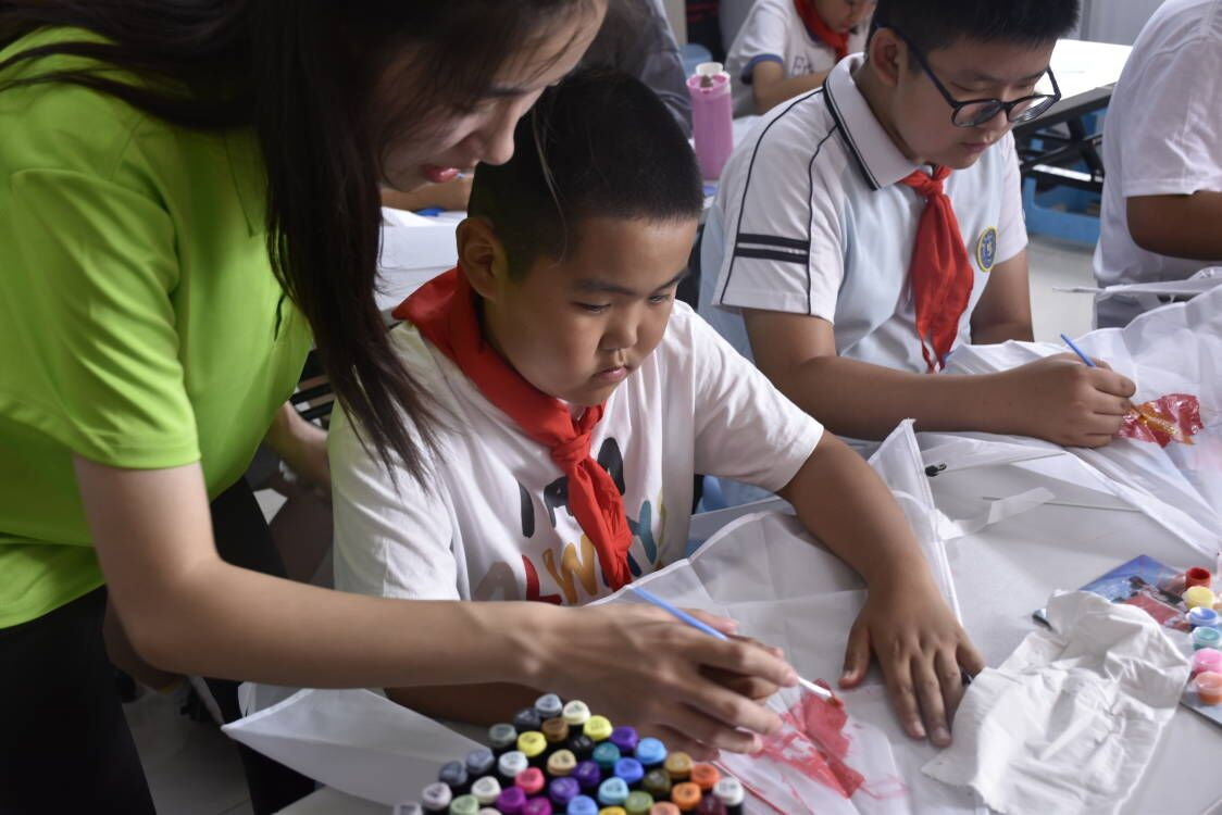 实践团成员教社区少年儿童手绘爱国风筝