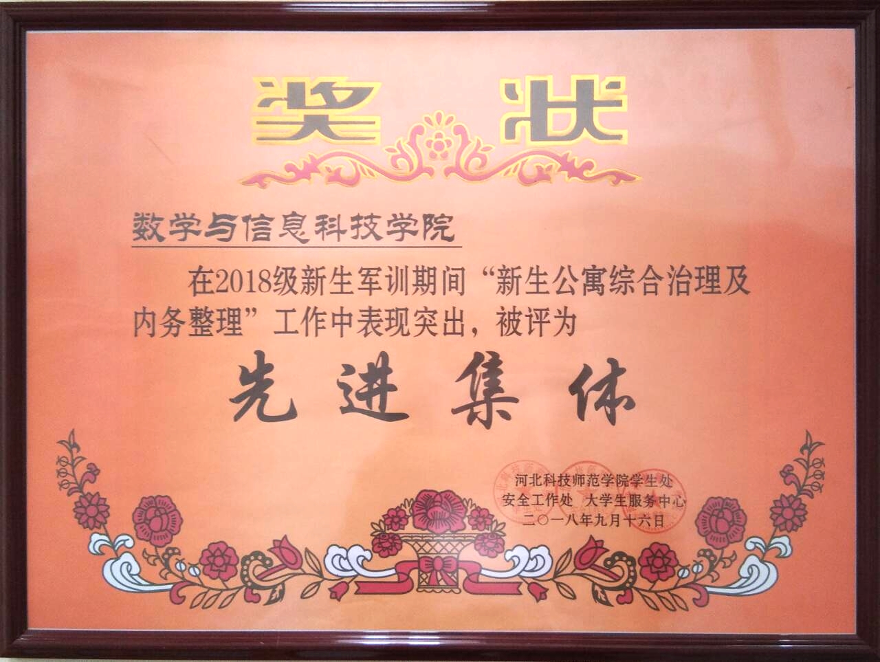 军训期间,全体同学们,在教官和老师的领导下他们发扬部队军人流血流汗不流泪掉皮掉肉不掉队的吃苦精神不惧骄阳,刻苦训练;同时,学院领导、新生班主任及全体新生积极投身公寓综合治理及内务整理活动中,经过学校、学院多次检查评比,学院有30个宿舍被评为学校先进宿舍,经过师生的共同努力,数信学院在2018级新生军训期间公寓综合治理及内务整理考评工作中又获佳绩,连续三年获得先进集体殊荣。