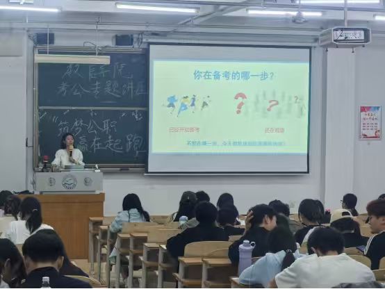 2025年9月25日,数信学院于逸夫楼B303教室顺利举办“筑梦公职,赢在起跑”公考专题讲座。本次讲座特邀资深考公指导专家秦亚楠老师主讲,吸引众多有考公意向的同学到场聆听。