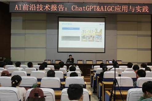 在前沿技术讲座活动中,学院聘请了企业讲师做关于ChatGpt与AIGC应用与实践的讲座。在ChatGPT及生成式人工智能AlGC爆发的时代,如何引导学生正确使用ChatGPT & AIGC技术,是教育教学中不可或缺的一环。在此次讲座过程中,周老师讲述了从ChatGPT到AIGC、大模型带来的行业影响、问答体验、ChatGPT的使用和调教以及AIGC应用等内容。讲座引起了同学对ChatGPT等人工智能技术的浓厚兴趣,激发同学们学习的热情。于张红老师为报告做了筹备工作。